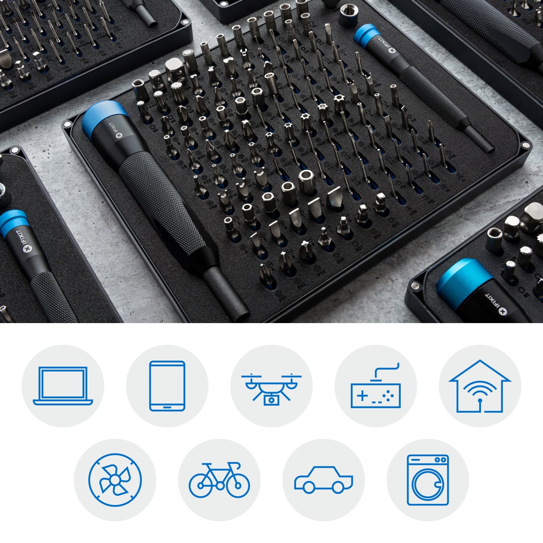The Manta Driver Kit includes iFixit's 1/4" Drive and 4 mm Drive premium aluminum screwdriver handles with magnetic bit sockets, knurled grips, and swivel tops—plus 112 precision driver bits.